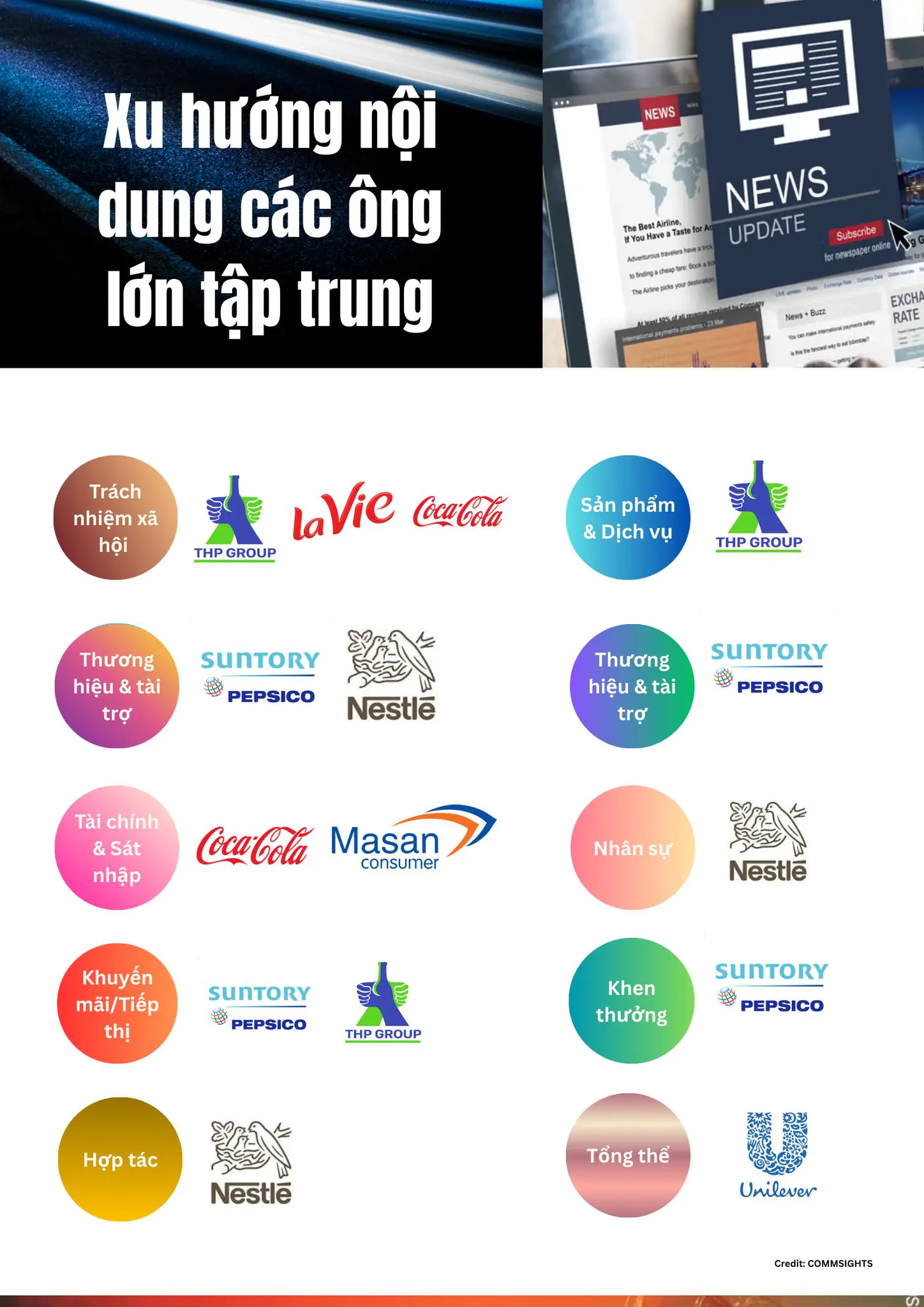 Tân Hiệp Phát là công ty đi mạnh nhất về mảng tin sản phẩm gồm tin Promotion/ Marketing, Product & Service, bên cạnh tin CSR. Coca Cola là công ty duy nhất tập trung vào nội dung Invesment/ M&A, bên cạnh CSR. Còn lại, Unilever đi mạnh nội dung tổng thể - Others; Masan nổi bật với tin Finance và Lavie với tin CSR.